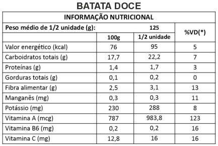 Rica em betacaroteno, um antioxidante que o corpo converte em vitamina A, ela ajuda na saúde ocular e no sistema imunológico. Além disso, a batata doce contém fibras que promovem a saúde digestiva e ajudam no controle dos níveis de açúcar no sangue. Suas propriedades nutricionais incluem também vitamina C, potássio e manganês, que beneficiam o metabolismo e a saúde cardiovascular.